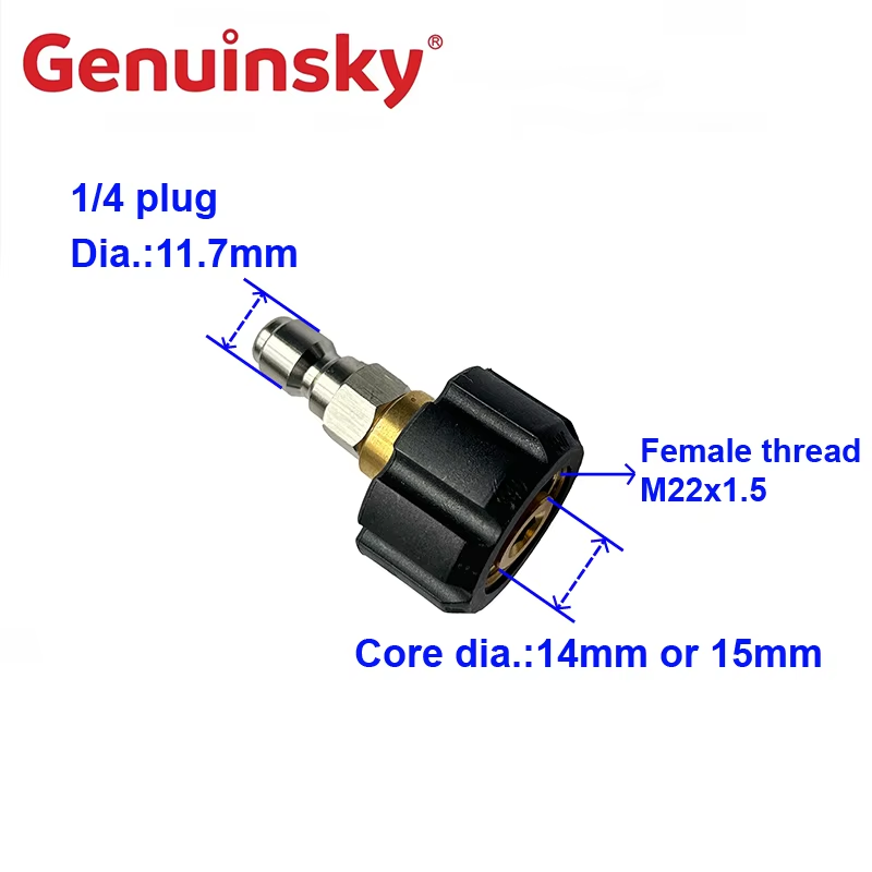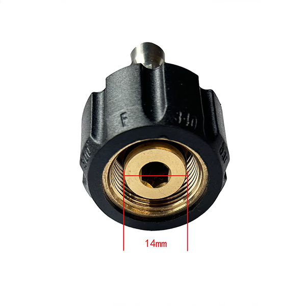 এই পণ্যটি 1/4 ইঞ্চি দ্রুত প্লাগ। কুইক প্লাগের ব্যাস 11.7 মি, এবং অন্য প্রান্তটি এম 22 × 1.5 মহিলা থ্রেড। কোর ডায়া .14 মিমি বা 15 মিমি থেকে বেছে নিতে দুটি গর্ত ব্যাস রয়েছে। এটি আধুনিক সমাজে অনেকগুলি উচ্চ-চাপ পরিষ্কার করার পরিস্থিতিতে ব্যাপকভাবে ব্যবহৃত হয়।