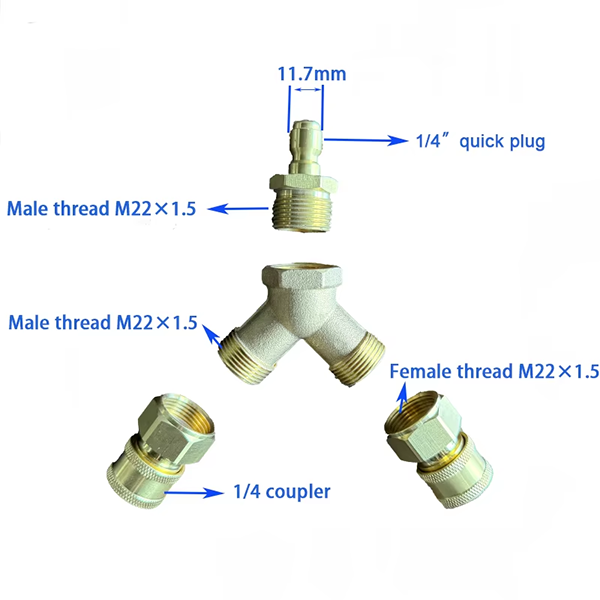 দুটি মডেল রয়েছে, প্রথমটি হ'ল 1/4 "প্লাগ এবং 2 পিসি 1/4" কাপলার সহ একটি ত্রি-মুখী সংযোগকারী। 1/4 "প্লাগের একটি প্রান্তে 11.7 মিমি ব্যাস সহ একটি দ্রুত প্লাগ ডিজাইন রয়েছে এবং অন্য প্রান্তটি পুরুষ থ্রেড এম 22 × 1.5। দুটি 1/4" কাপলারের এক প্রান্তটি মহিলা থ্রেড এম 22 × 1.5, এবং অন্য প্রান্তটি 1/4 সহকর্মী। দ্বিতীয়টি 3/8 "প্লাগ এবং 2 পিসি 3/8" কাপলার্স 3/8 "প্লাগ সহ একটি ত্রি-মুখী সংযোগকারী। এক প্রান্তটিও একটি দ্রুত প্লাগ ডিজাইন, এবং অন্য প্রান্তটি পুরুষ। উপাদানটি পূর্ণ তামা, যার ভাল জারা প্রতিরোধের ভাল এবং গাড়ি ধোয়ার জটিল পরিবেশে একটি স্থিতিশীল সংযোগ বজায় রাখতে পারে। একই সময়ে, তামার একটি নির্দিষ্ট শক্তি এবং দুর্দান্ত নমনীয়তাও রয়েছে, যা উচ্চ-চাপ পরিষ্কার পরিবেশের জন্য একটি নির্ভরযোগ্য পছন্দ। 1/4 ইঞ্চি আকারটি গাড়ি ওয়াশিং মেশিন, স্প্রে বন্দুক এবং অন্যান্য সরঞ্জামগুলিতে নমনীয়ভাবে অভিযোজিত হতে পারে। 3/8-ইঞ্চি স্পেসিফিকেশন বৃহত্তর প্রবাহের ব্যবহারের ক্ষেত্রে প্রয়োগ করা যেতে পারে যেমন বড় যানবাহন পরিষ্কার করা বা শিল্প সরঞ্জাম পরিষ্কার করা, যা পরিষ্কারের দক্ষতার উল্লেখযোগ্যভাবে উন্নত করে।