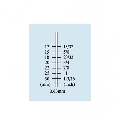 এমপি 630 এ এয়ার মাইক্রো পিনারের জন্য পেরেক বা পিনের আকারটি ছোট এবং পাতলা, আকার 12-30 মিমি (15/32 থেকে 1-3/16 ইঞ্চি), জিএ 23, ডায়া। 0.63 মিমি।