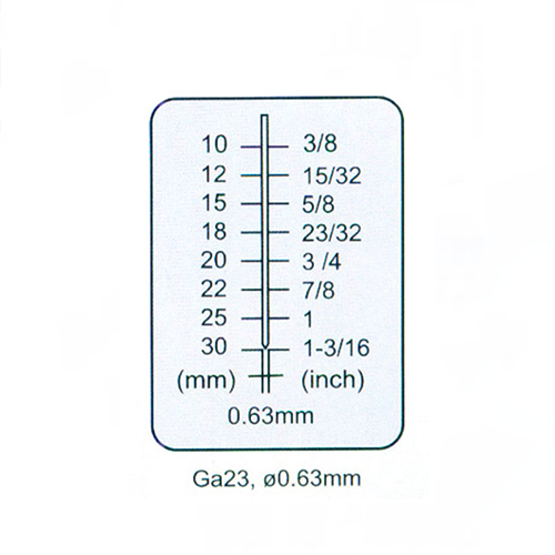 এমপি 630 বি এয়ার মাইক্রো পিনারের জন্য পেরেক বা পিনের আকারটি ছোট এবং পাতলা, আকার 12-30 মিমি (15/32 থেকে 1-3/16 ইঞ্চি), জিএ 23, ডায়া। 0.63 মিমি।