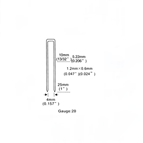 এনএস 422 জে সংকীর্ণ ক্রাউন স্ট্যাপলার জনপ্রিয় এয়ার পেরেক বন্দুক। উপযুক্ত পেরেক জিএ 20, 1.2x0.6 মিমি, কাঁধের দূরত্ব 4 মিমি (0.157 "), পেরেকের উচ্চতা 10 মিমি - 25 মিমি (13/32 থেকে 1 ইঞ্চি) হতে পারে।