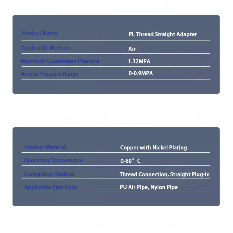 PL থ্রেড স্ট্রেইট অ্যাডাপ্টার এবং টিউব এমনকি ইনস্টলেশনের পরে 360° অবাধে ঘোরাতে পারে, যার মানে এটি ঐতিহ্যগত জয়েন্ট অ্যাঙ্গেল ফিক্সেশনের সীমাবদ্ধতা ভঙ্গ করতে পারে। এটি জটিল পাইপলাইন প্রবণতার সাথে খাপ খাইয়ে নিতে পারে এবং পণ্যের প্রযোজ্য পরিস্থিতি আরও বিস্তৃত। একই সময়ে, পণ্যটির বিভিন্ন পরিস্থিতিতে মানিয়ে নেওয়ার সহনশীলতা রয়েছে। উদাহরণস্বরূপ, এটি উচ্চ-তাপমাত্রার উত্পাদন লাইনে স্থিতিশীল কর্মক্ষমতা বজায় রাখতে পারে, কারণ পণ্যটির সহনশীলতার পরিসর নিজেই 0-60 ডিগ্রি সেলসিয়াসের তাপমাত্রা পরিসরে থাকে। উপরন্তু, সর্বাধিক নিশ্চিত চাপ 1.32MPa এ পৌঁছাতে পারে এবং স্বাভাবিক কাজের চাপের পরিসর হল 0-0.9MPa, যা বায়ুসংক্রান্ত সরঞ্জাম এবং স্বয়ংক্রিয় সিলিন্ডারের মতো উচ্চ-চাপের কাজের অবস্থার প্রয়োজন এমন সরঞ্জামগুলির স্থিতিশীল অপারেশনকে সম্পূর্ণরূপে কভার করতে পারে।