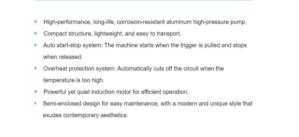 দ্বিতীয়ত, STG-ROCK-K পোর্টেবল হাই-প্রেশার ওয়াশার সামগ্রিকভাবে একটি কমপ্যাক্ট কাঠামো গ্রহণ করে এবং সামগ্রিক শরীরের ওজন খুব হালকা। K3 এর নেট ওজন 10 কেজি, এবং K4 এর নেট ওজন 12 কেজি, উভয়ই উপরে হ্যান্ডেল ডিজাইন দিয়ে সজ্জিত, যা সুবিধাজনক। ব্যবহারকারীরা তাদের পরিচ্ছন্নতার চাহিদা অনুযায়ী বাড়ি থেকে বাইরে যেতে পারেন। একই সময়ে, ডিভাইসটি স্বয়ংক্রিয় স্টার্ট-স্টপ এবং ওভারহিটিং সুরক্ষার বুদ্ধিমান ফাংশনগুলির সাথে সজ্জিত। শুরু করতে স্প্রে বন্দুকের ট্রিগারটি টানুন এবং থামাতে ট্রিগারটি ছেড়ে দিন। কোন ম্যানুয়াল সুইচ প্রয়োজন হয় না, যা অপারেশন আরও সুবিধাজনক করে তোলে। ওভারহিটিং সুরক্ষা ডিভাইসটিকে স্বয়ংক্রিয়ভাবে বর্তনী কেটে ফেলার অনুমতি দেয় যখন তাপমাত্রা খুব বেশি হয়, ওভারলোডিং এড়ানোর ফলে মেশিনের ক্ষতি হয়, সামগ্রিক নিরাপত্তার উন্নতি হয় এবং ব্যবহারের সময় পণ্যটিকে নিরাপদ এবং আরও উদ্বেগমুক্ত করে। ফিউজলেজের আধা-বন্ধ নকশাটিও খুব মানবিক, যা প্রতিদিনের রক্ষণাবেক্ষণের জন্য সুবিধাজনক, এবং সহজেই অংশগুলি পরীক্ষা করতে এবং ফিল্টার পরিষ্কার করতে পারে।